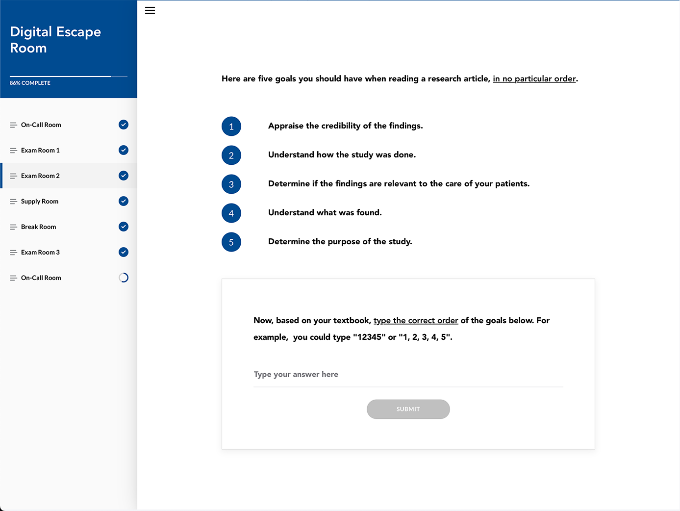 The new fifth edition of Brown's Evidence-Based Nursing: The Research-Practice Connection features an engaging learning experience for nursing students with a unique Digital Escape Room. Accessed through Navigate Advantage, students play the part of a new practitioner at an urgent care center as they progress through a fun scenario set up by a friendly coworker. Students will take 20-30 minutes to read an article and answer questions on nursing burnout to find clues and move through various rooms at the urgent care center before making their “escape.”